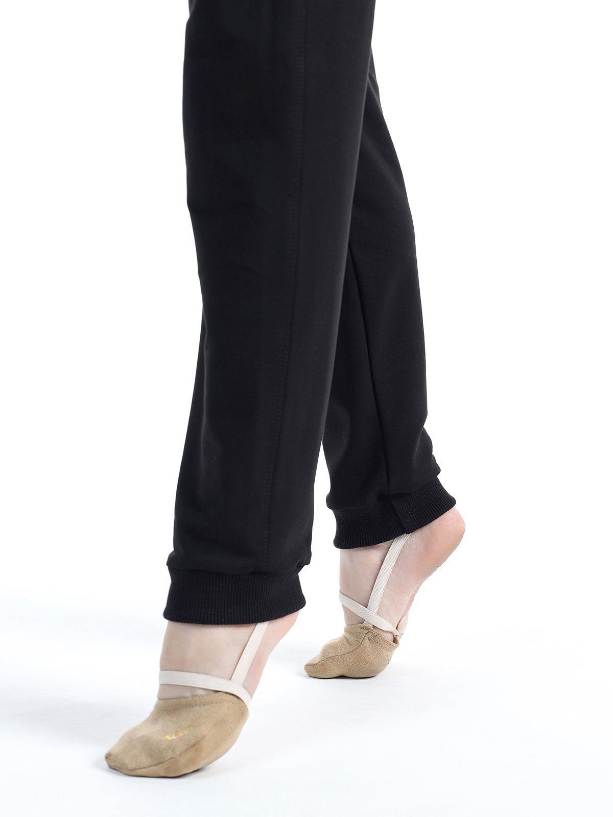 Black, loose-fitting trousers with a soft waistband and elasticated drawstring. Cuffs at the bottom.